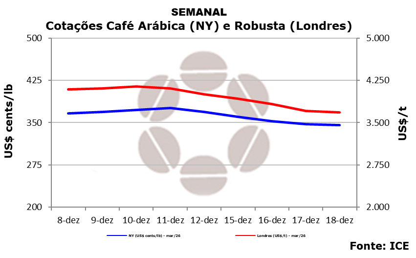 No mercado físico, pesquisadores do Cepea/Esalq-USP registraram queda para o arábica e subida para o robusta. As negociações foram concluídas a R$ 2.149,88 por saca, queda semanal de 4,62%, e a R$ 1.229,48 por saca, recuo de 7,74% na semana – apesar da alta do dia (18/12), respectivamente.