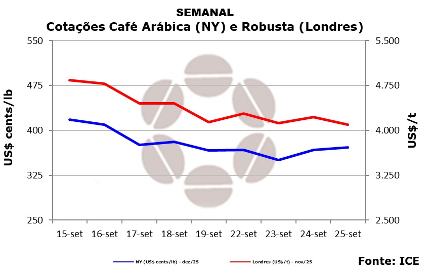 Na Bolsa de Londres (ICE Futures Europe), o contrato de robusta para novembro/25 fechou em baixa de 2,96%, cotado a US$ 4.094 por tonelada. Na variação semanal, as perdas acumularam 0,99% (41 dólares).