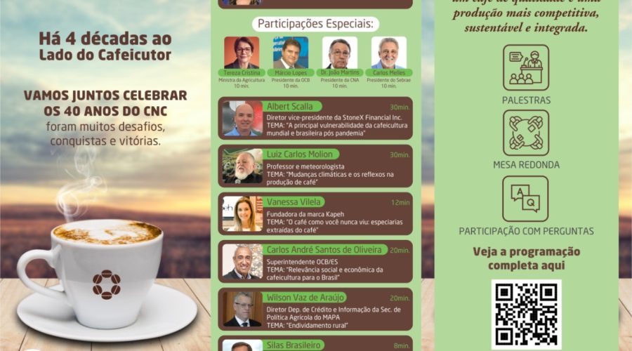 Desde 1981 lutando pela cafeicultura nacional, o Conselho Nacional do Café (CNC) comemora em julho seus 40 anos de existência. E, para marcar a data, o CNC fará um grande evento online com participação de algumas das maiores autoridades brasileiras do setor.