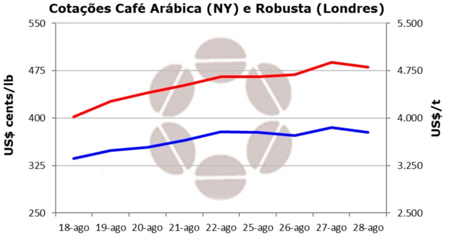 O aumento dos preços por parte da indústria de café e das cafeterias surgiu como um novo fundamento e pressionam a cotação dos futuros de arábica na Bolsa de Nova York (ICE Futures US), sem que o mercado perca de vista a questão dos volumes de estoque, tarifaço, intempéries climáticas no Brasil, entre outros. O contrato com vencimento em dezembro/25 fechou a sessão de ontem...