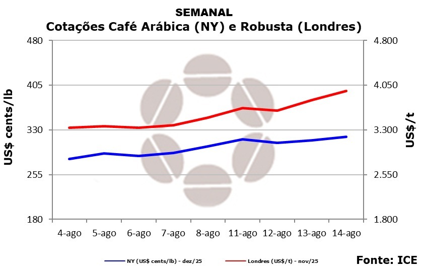 Na Bolsa de Londres (ICE Futures Europe), o contrato de robusta para novembro/25 fechou em alta de 4,03% (153 dólares), cotado a US$ 3.952 por tonelada. Na variação semanal, os ganhos acumularam 12,59% (442 dólares).