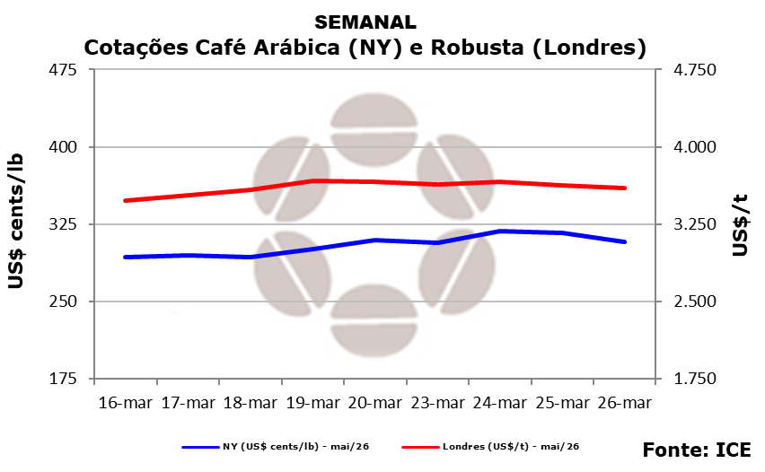 Na ICE Futures Europe, os contratos futuros de café robusta também recuaram. O vencimento maio/26 apresentou desvalorização de 0,91% (33 dólares), sendo negociado a 3.596 dólares por tonelada. O fechamento semanal apresentou baixa de 1,86% (68 dólares)