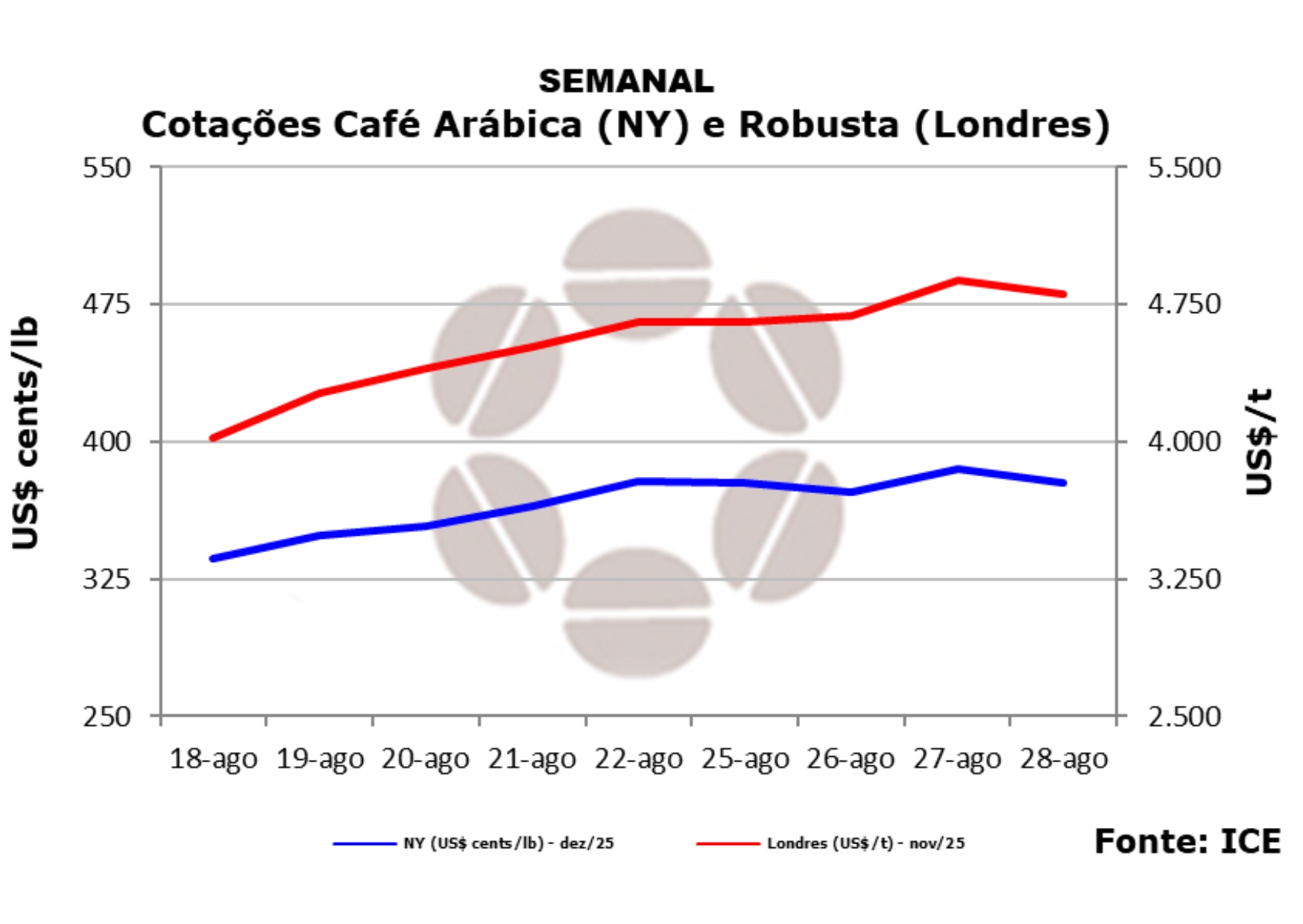 Os contratos futuros do café devem encerrar a semana com desempenho positivo na Bolsa de Nova York (ICE Futures US). Mesmo com as oscilações e incertezas com relação ao tarifaço de Trump, o mercado sinaliza resistência e pode se manter, no curto prazo, no patamar de 300 centavos de dólar por libra-peso. O contrato com...