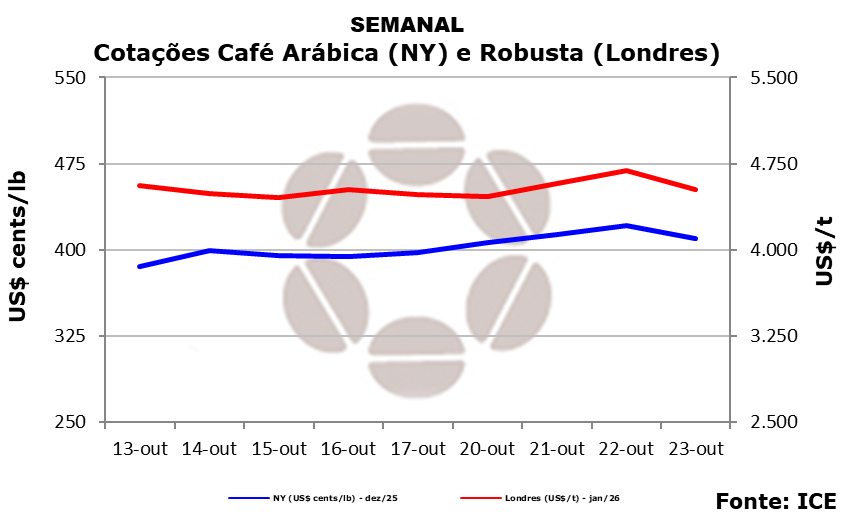 Em Londres (ICE Futures Europe), o contrato jan/26 também encerrou o dia com baixa, registrando queda de 3,69% (173 dólares), a 4.521 dólares por tonelada, com alta semanal de 0,96% (U$ 43).