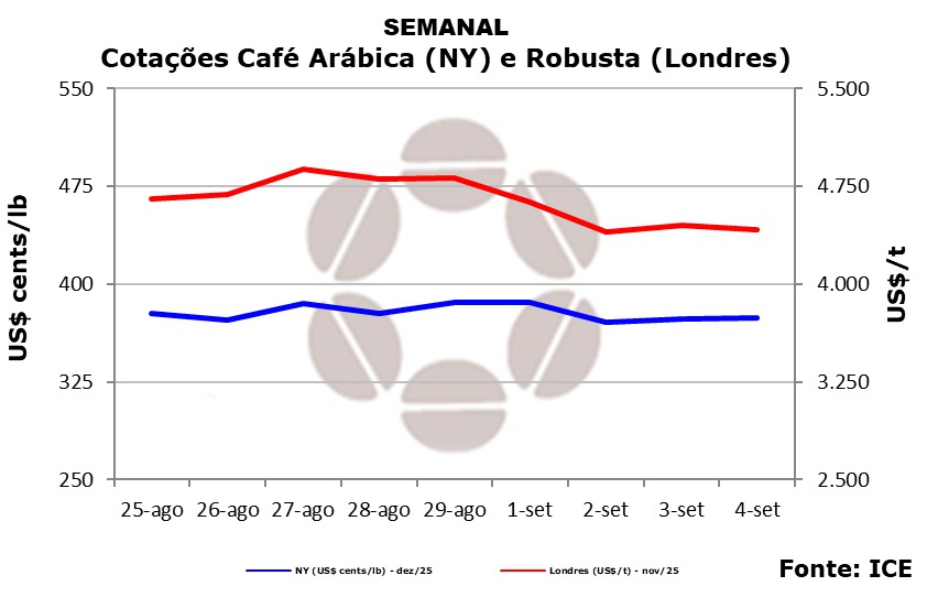 Já na Bolsa de Londres (ICE Futures Europe), os contratos de café robusta acumularam uma queda semanal mais acentuada que a observada em Nova York. Com vencimento em novembro/25, o contrato recua 8,3% no acumulado (U$ 401) e fechou a última quinta-feira a U$ 4.414 por tonelada, o que representa perda de 0,90% (U$ 40) no dia. Até aqui, a semana registra queda de 8,33% (U$ 401).