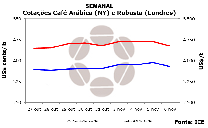 Na Bolsa de Londres (ICE Futures Europe), os contratos de robusta também encerraram o dia em queda. O vencimento janeiro/25 caiu 3,33% (US$ 156), para US$ 4.530 por tonelada. Na semana, o fechamento foi de queda de 0,22% (US$ 10).