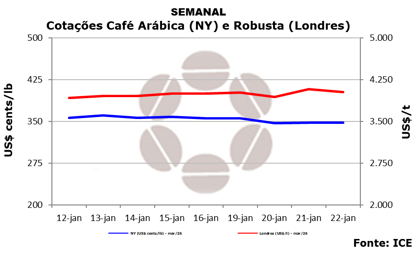 Na Bolsa de Londres (ICE Futures Europe), os futuros de robusta seguiram caminho diferente de Nova York, devolvendo parte dos ganhos do dia anterior. O contrato para março/26 recuou 1,28% (52 dólares), fechando em 4.026 dólares a tonelada. O desempenho semanal ficou positivo em 0,65% (26 dólares).
