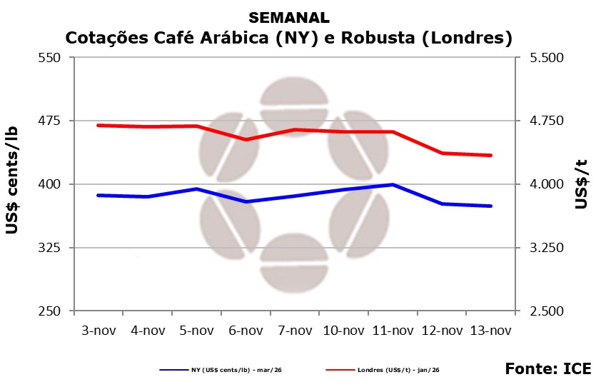 Ontem, os futuros de arábica fecharam novamente em queda na Bolsa de Nova York (ICE Futures US). O contrato março/26 recuou 240 pontos (-0,64%), para 374,25 centavos de dólar por libra-peso. Na semana, o acumulado é de queda de 3,01% (1.160).