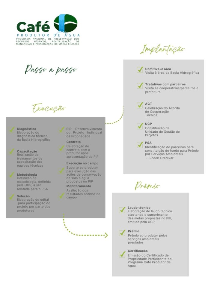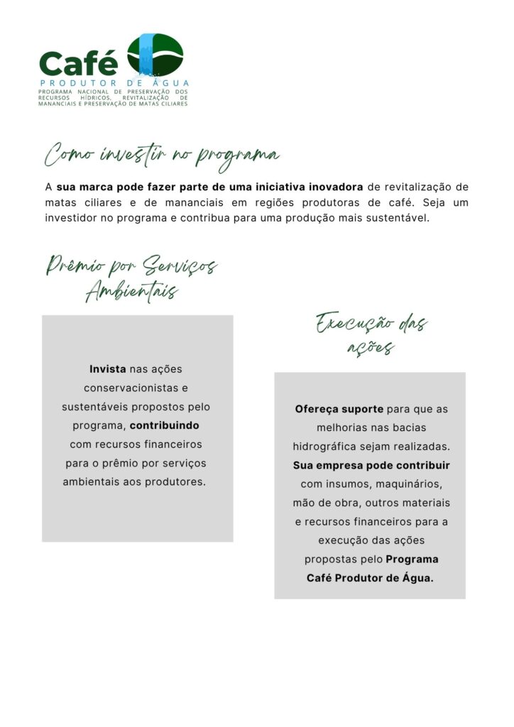 O Programa Café Produtor de Água é uma estratégia construída da constante busca por sustentabilidade na cadeia produtiva do café e da necessidade da revitalização ambiental das bacias hidrográficas nas quais estão inseridas as regiões produtoras de café.